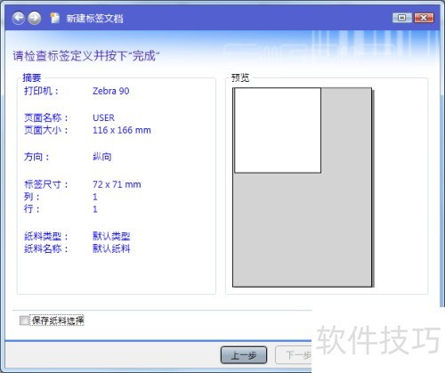 7、 进入标签文档设置完成界面后,请仔细核对各项配置是否满足您的需求。若发现错误,可点击上一步返回修改;若无问题,请点击完成确认。至此,一个全新的CODESOFT 2015标签文档已成功创建并配置完毕,可进入下一步操作。