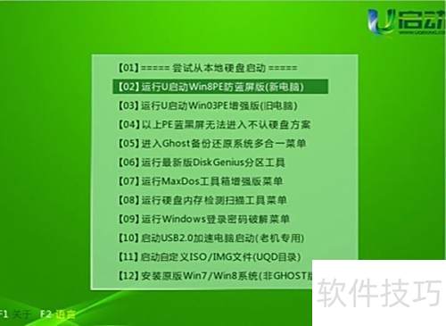 1、 将U盘插入电脑USB接口,重启后按下启动快捷键,进入启动选择界面,选中U盘启动项并回车,进入U启动主菜单。选择运行U启动Win8PE防蓝屏版(适用于新电脑),系统将自动加载相关界面,准备进行后续操作。
