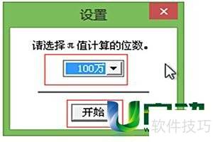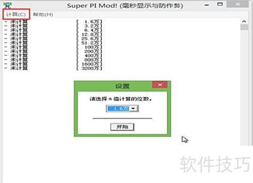 3、 在Super PI Mod界面中,选择菜单栏的计算选项,将弹出π值计算位数的设置窗口,具体所示。