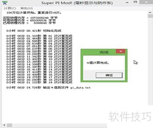 6、 测试结束后将生成记录π值的txt文件,耗时越短说明CPU性能越强,点击确定关闭窗口即可,所示。