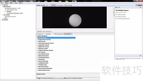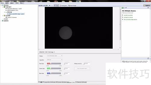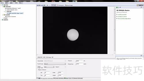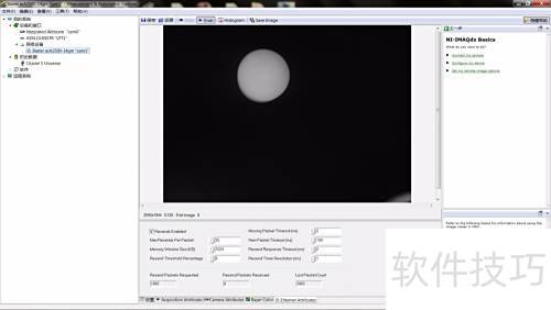 2、 打开NI MAX后,选择网络设备中的Basler acAdemic2500-14gm型号相机cam1。通过工具栏可执行图像保存、还原、单帧采集(Snap)、连续采集(Grab)、直方图分析及图像存储等操作。同时,可在界面中配置图像采集属性,调整Acquisition Attributes相关参数,以满足实际采集需求,确保图像质量与采集过程的稳定性,提升整体使用体验。