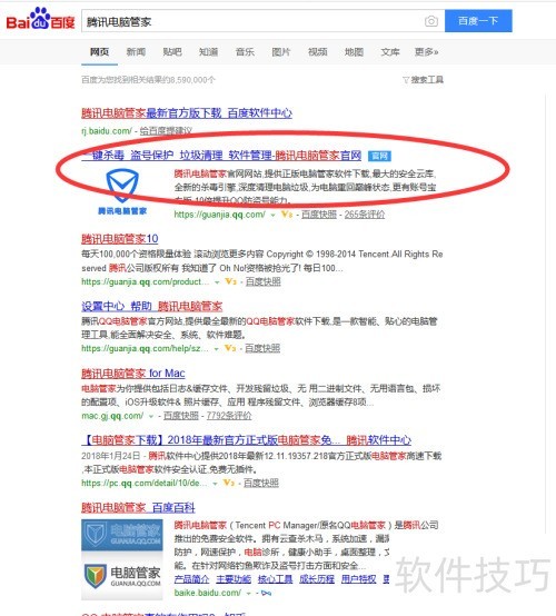 1、 启动电脑并打开浏览器,进入百度官网,在搜索栏中输入腾讯电脑管家,点击搜索按钮,查找相关信息。