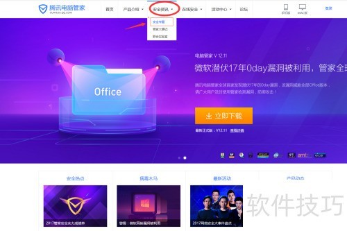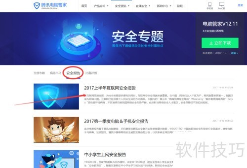 2、 访问腾讯电脑管家官网,依次选择安全资讯、安全专题和安全报告栏目。