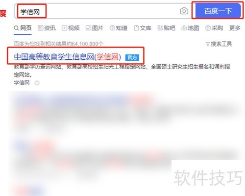 1、 进入百度首页,搜索学信网,点击百度一下,在结果中选择并进入学信网官方网站。
