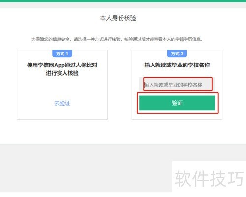 5、 请完成身份验证,在第二种方式中输入毕业院校名称后点击验证即可。