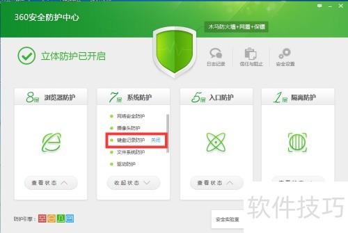 5、 将鼠标移至键盘记录防护器旁边,可看到开启状态,所示。