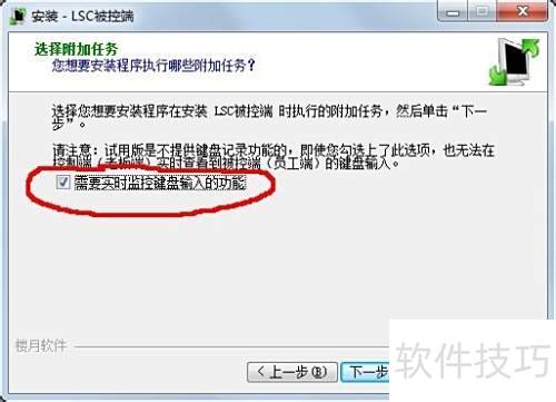 3、 请在对方电脑安装LSC被控端(员工端).exe,安装时务必勾选启用实时监控键盘输入选项,具体操作所示。