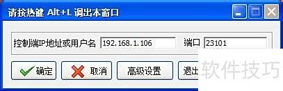 4、 安装软件后,首次会自动显示设置窗口,后续可按Alt+L调出。在第一个文本框中输入控制端电脑的IP地址,然后点击确定即可完成配置。