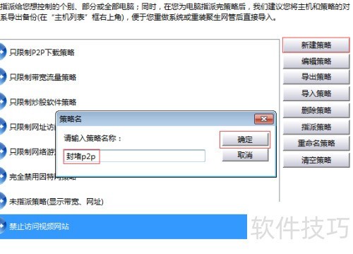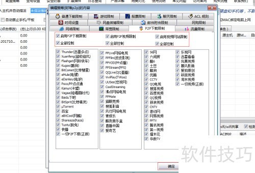 16、 在策略编辑界面顶部点击P2P下载限制选项,勾选启用P2P下载限制、P2P视频限制及视频网站限制,随后全选所有控制项目,最后依次确认并返回主界面完成设置。