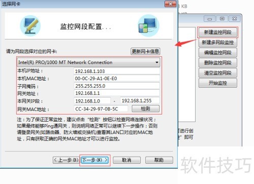 11、 在弹出界面中选择新建监控网段,进入下一步,按提示选定用于抓包的主控网卡,结合局域网布局调整相应参数,随后连续点击下一步直至完成配置。