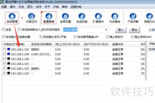 14、 在主界面左上角点击启动管理,系统将自动扫描并列出网段内的活跃主机,随后点击右侧的配置策略进行设置。