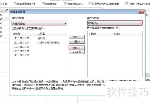 18、 在左侧选定策略中选择未指派策略,右侧选择新建的封堵P2P策略,中间点击全部>>完成操作。