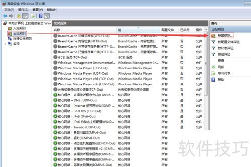 3、 在高级安全Windows防火墙界面,左侧选择出站规则,右侧点击新建规则进行设置。