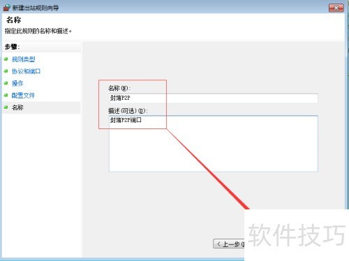8、 在名称栏填写封堵P2P,描述栏写封堵P2P端口,名称与描述内容可自定义,填写完毕后点击完成即可。
