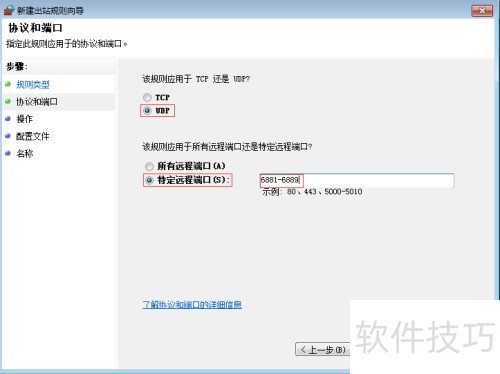 5、 选择UDP协议及指定远程端口,输入6881至6889端口范围(常见于P2P应用),确认后点击下一步完成设置。