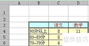 4、 在进行各科目成绩统计时,首先需统计不同分数段的学生人数。打开新的工作表,定位至C4单元格,输入公式COUNTIF(期中成绩!\$D\$2:\$D\$24,>=90),用于统计语文成绩中90分及以上的人数。接着,在C5单元格输入COUNTIF(期中成绩!\$D\$2:\$D\$24,>=80)-C4,计算80至89分区间的人数,减去前一段人数以避免重复。随后,在C6单元格中输入=COUNTIF(期中成绩!\$D\$2:\$D\$24,>=70)-C4-C5,用以得出70至79分之间的学生数量。在C7单元格输入=COUNTIF(期中成绩!\$D\$2:\$D\$24,>=60)-C4-C5-C6,计算60至69分段的人数。通过上述步骤,即可准确获得语文科目在各个分数段的分布情况,为后续的成绩分析和图表绘制提供清晰的数据支持。整个过程操作简便,逻辑清晰,便于快速掌握班级整体学习状况。
