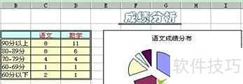 5、 选中B4至C8区域,点击常用选项卡中的图表向导,选择饼图类型,并在子类型中选取分离型饼图。连续点击两次下一步,在图表标题栏输入语文成绩分布,再点击下一步直至完成,即可生成所需的成绩分布图。整个过程操作简便,直观展示各分数段占比情况。