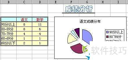11、 选中B4至C8区域的单元格,点击常用工具栏中的图表向导按钮,选择饼图类型,并在右侧子类型中选取分离型饼图。连续点击两次下一步,在图表标题栏输入语文成绩分布,再点击下一步直至完成,即可生成所需的成绩分布图。