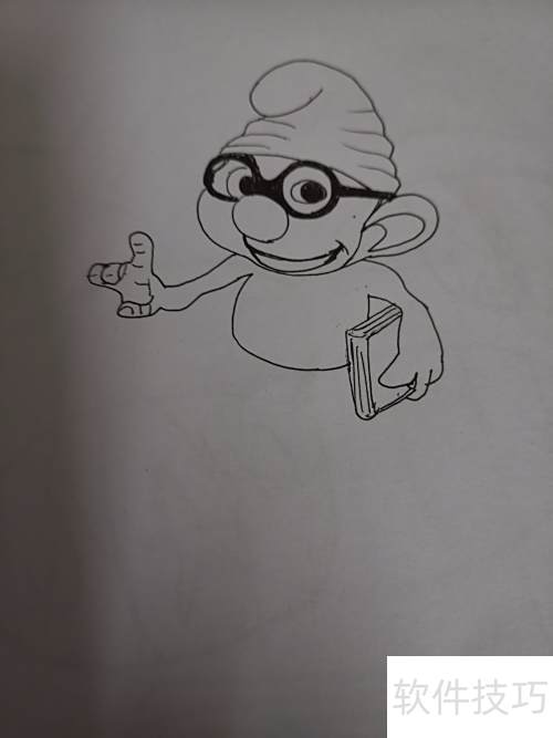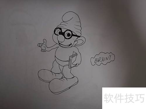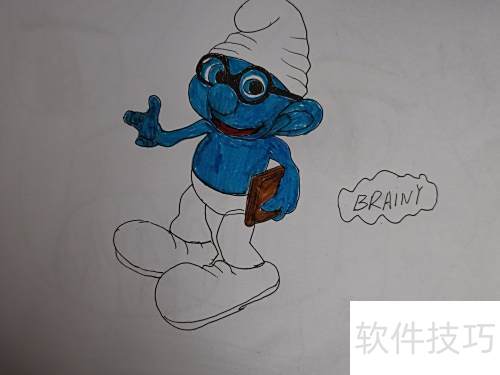 7、 用蓝色水彩笔为蓝精灵的身体上色,聪聪的漫画形象便完成了。