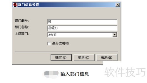 7、 在弹出的部门信息窗口中,依次输入部门编号与名称,具体操作所示。