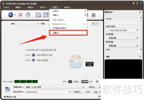 1、 在ImTOO Blu-ray Ripper SE主界面顶部,选择冷之工柱吐盆具(T)菜单选项。