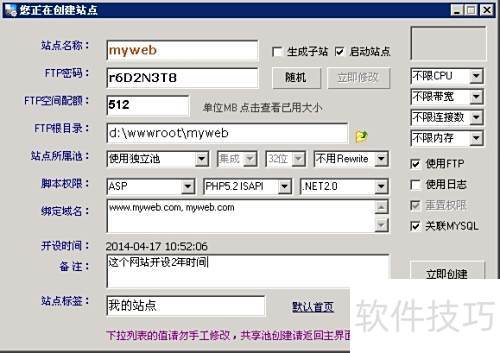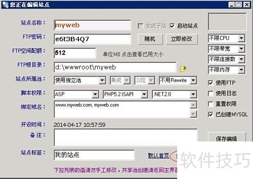21、 可备注站点名称或所装程序,如Discuz,便于管理,亦可保留默认设置。