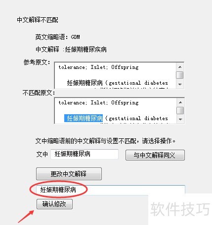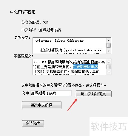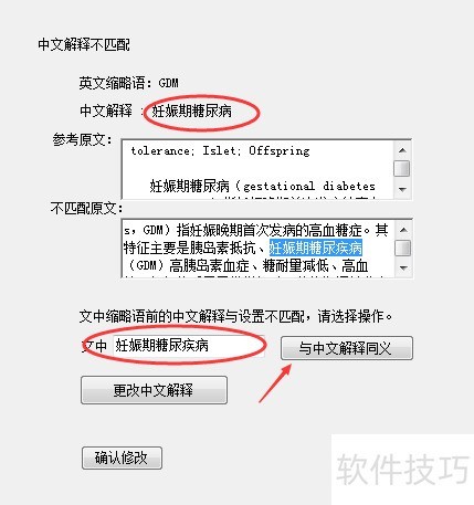 7、 当文章中同一缩写对应不同中文解释时,系统将提示中文解释不匹配。用户可选择不一致的解释,点击与中文解释同义按钮,系统即自动统一为相同中文释义,确保全文术语一致。