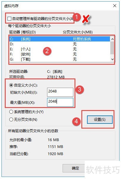 4、 取消勾选自动管理所有驱动器的分页文件大小,选择目标盘符,设置为自定义大小,输入初始值和最大值,确认后点击设置完成配置。