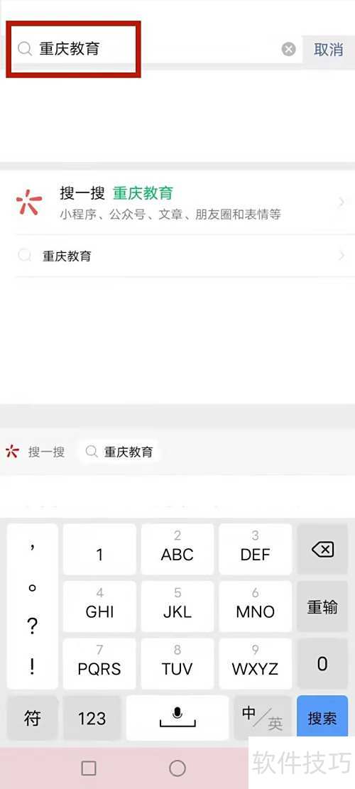 1、 打开手机微信,点击放大镜,搜索并进入重庆教育。