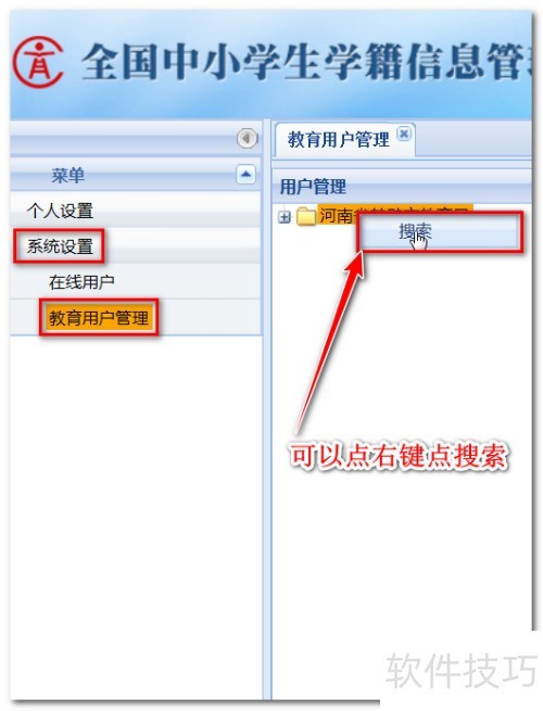 3、 进入系统设置,选择教育用户管理,右侧用户处右键点击进行搜索操作。