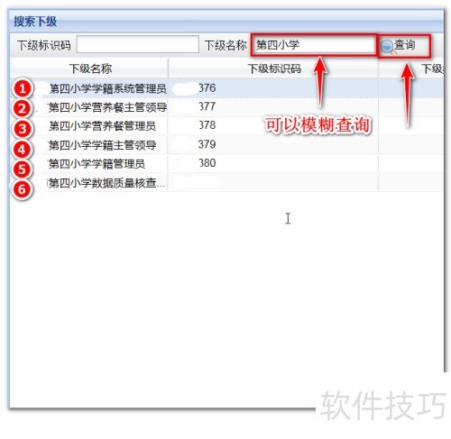 4、 开启搜索功能后,在名称栏输入学校名称(支持模糊查询),点击查询即可查看该校关联的六个账号信息。