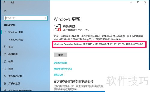 4、 首先处理Windows Defender病毒库更新失败问题,具体为KB2267602(版本1.261855.0)安装出错,错误代码0x80070643,需排查系统组件或更新服务异常,确保防病毒定义顺利下载并正确安装。