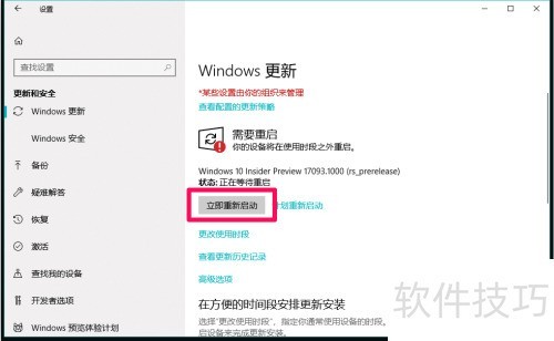 18、 系统已成功安装Windows 10 Insider Preview 17093.1000(rs_prerelease)更新文件,为确保更新生效,请立即重启计算机,点击立即重新启动以完成操作。
