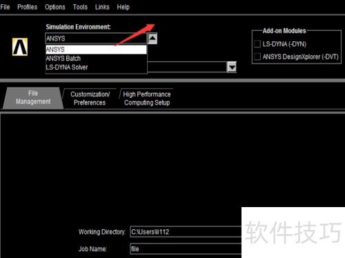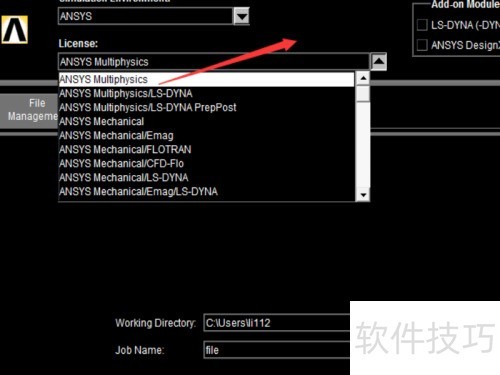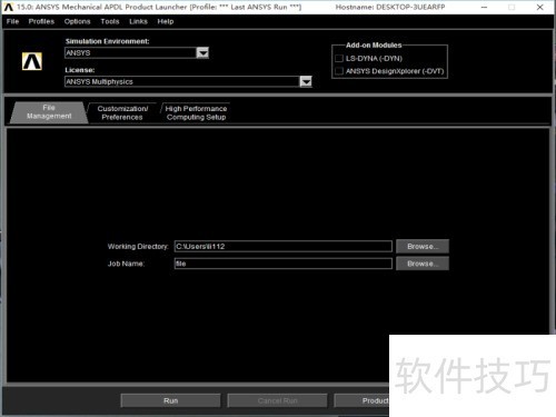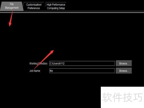 4、 点击文件管理后,通过鼠标选择工作目录,建议设在非C盘位置以避免系统干扰。随后在作业名称栏中输入文件名。每次启动ANSYS时都需重新设定文件名,防止当前操作覆盖之前保存的内容,确保数据安全与文件独立。