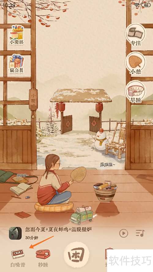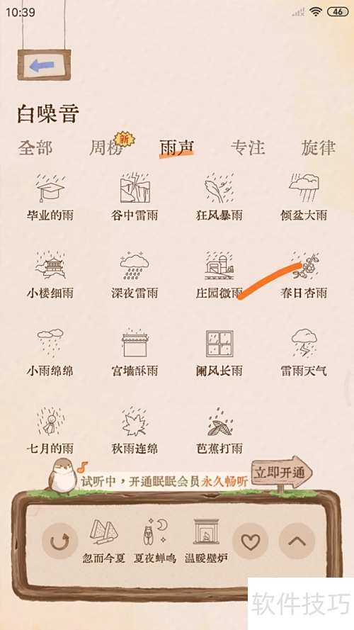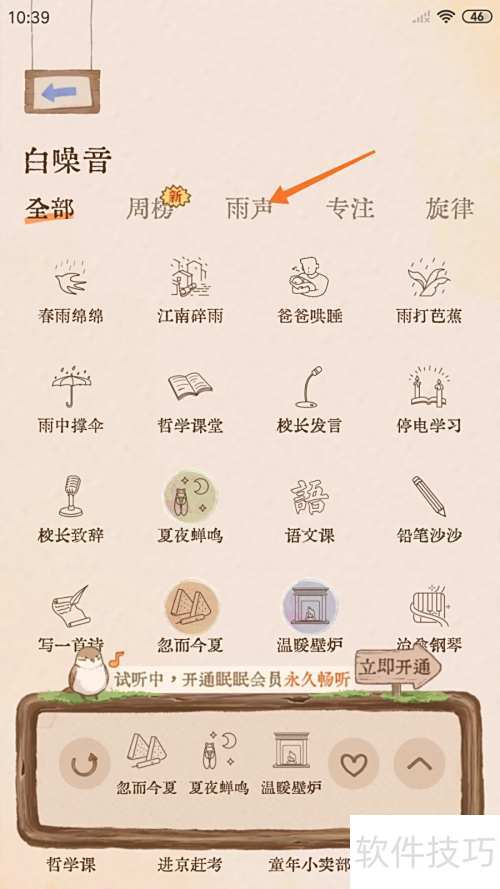 2、 进入白噪音页面后,点击顶部的雨声选项。
