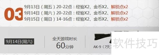 5、 9月14日周六晚8至10点,经验金币双倍,解锁点翻倍。
