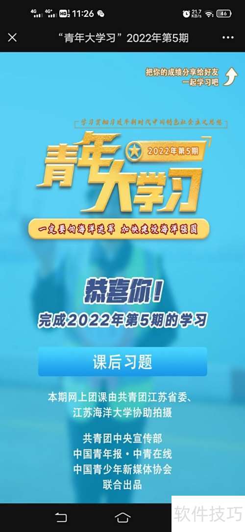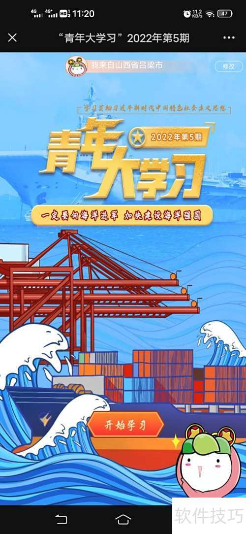 1、 打开青年大学习2022第五期,点击屏幕启动学习流程,立即进入课程学习。
