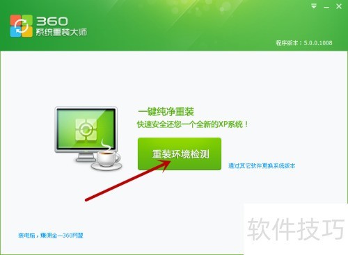 5、 添加完成后将弹出360系统重装大师新界面,点击其中央绿色按钮重装环境监测即可继续操作。