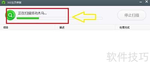 5、 在360主页修复界面中,进度条正显示扫描计算机项目的进程,请稍等片刻。