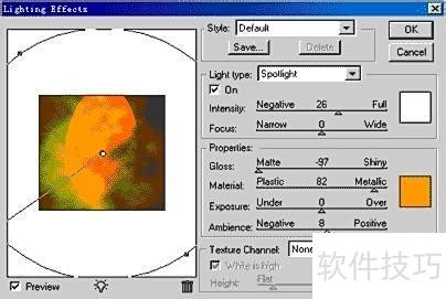 2、 在滤镜菜单中选择渲染下的光照效果,打开参数设置对话框。光源类型选择聚光灯,光源颜色设定为红色,亮度强度调整为100,聚焦程度也设为100。在下方属性区域中,将光滑度设置为-97,材料质感设为82,曝光度保持为0,环境光强度调整为8。在纹理通道选项中选择无,即不应用任何纹理贴图。完成上述参数配置后,画面将呈现出由红色聚光灯照射下的立体光影效果,物体表面具有较强的材质感和明暗对比,整体光照集中且富有层次,环境光补充适度,避免阴影过重,使图像视觉效果更加自然生动。具体设置界面所示。