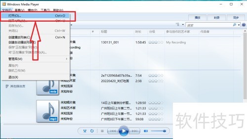 2、 在Windows媒体播放器中,按下Ctrl+M显示菜单栏,然后依次选择文件和打开即可。