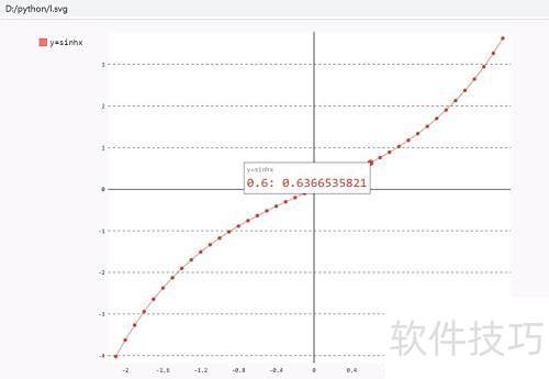 14、 第八步,观察绘制出的双曲正弦函数图像。该图为SVG格式,可用浏览器打开。将鼠标悬停在图像上时,会显示对应点的坐标信息。