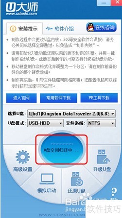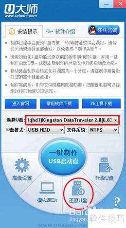 1、 打开u大师-u盘启动盘制作工具,插入U盘后,在界面右下角点击还原U盘。