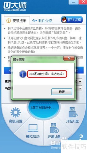 3、 稍等片刻,弹出归还U盘空间提示,操作成功完成。