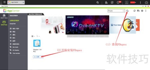 7、 打开应用中心,点击搜索栏输入FDupes,在结果列表中找到该应用图标。随后点击图标下方的安装按钮,系统将自动下载并完成安装。安装成功后,返回QTS主界面,在主菜单中即可查看并打开FDupes应用,进行后续操作。