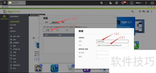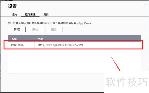 4、 进入设置中的程序来源选项,首先点击程序来源项,然后选择按钮,此时将弹出新增界面。在该界面中输入名称,例如QNAPClub,接着在对应栏位填写应用商店地址:https://www.qnapclub.eu/en/repo.xml。信息填写完成后,再次点击按钮,系统保存设置并返回程序来源的主设置页面,完成添加操作。