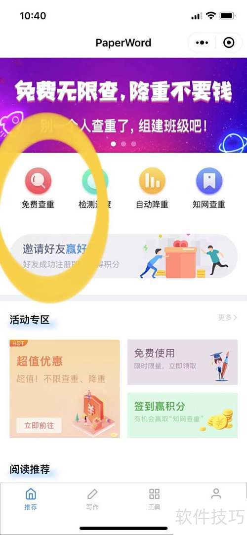 1、 首先在小程序中搜索并进入paperword论文查重功能。