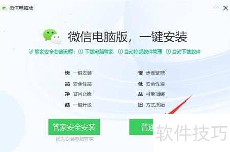 4、 弹出窗口后选择普通安装,按提示完成操作,安装完毕即可启动微信。