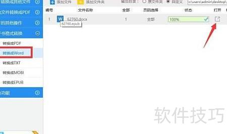 6、 耐心等待转换完成,随后点击右侧打开按钮,系统会自动调用Word程序启动并显示已转换的电子书文档。