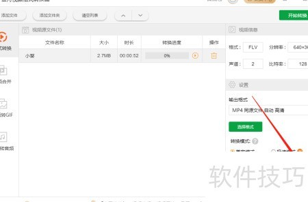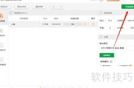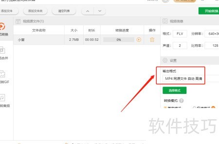 2、 上传FLV格式文件后,右侧选择输出格式,系统默认已设置为MP4格式。